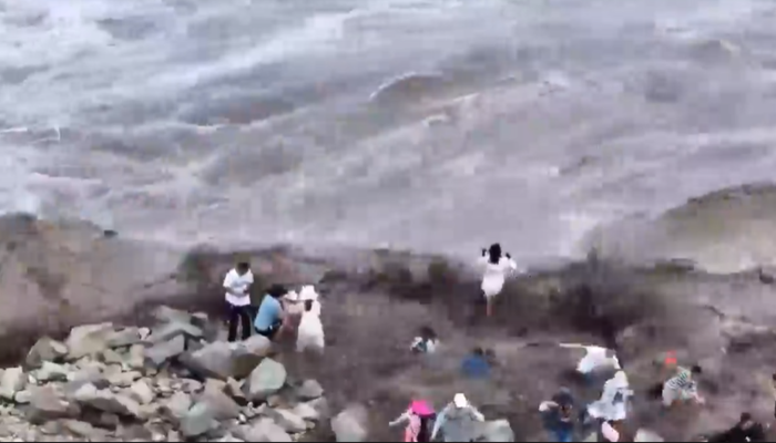 Çin'den korkutan görüntüler! Dalgalar insanları kayalara sürükledi